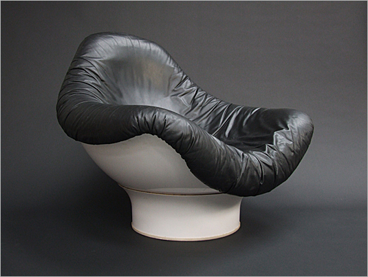 Lounge chair designed by Mario Brunu for Comfort, Italy 1968. White fibreglass seat shell upholstered in black leather upholstery.